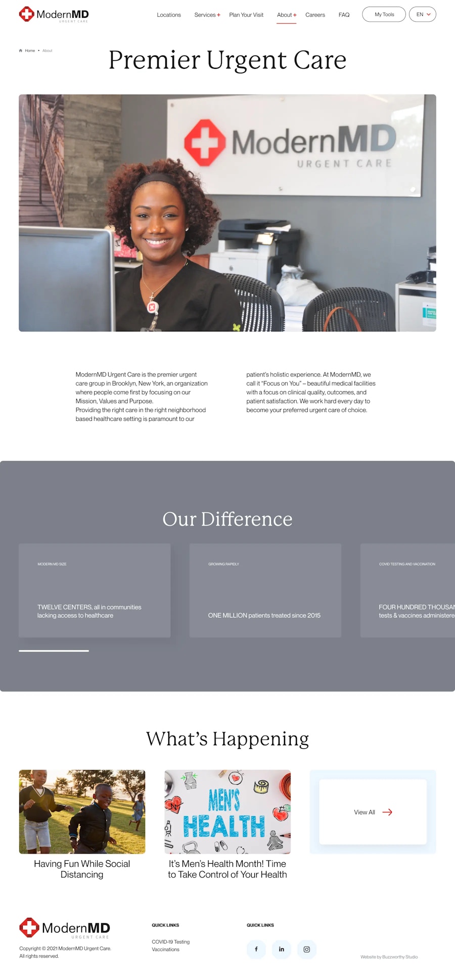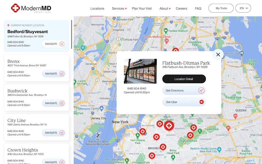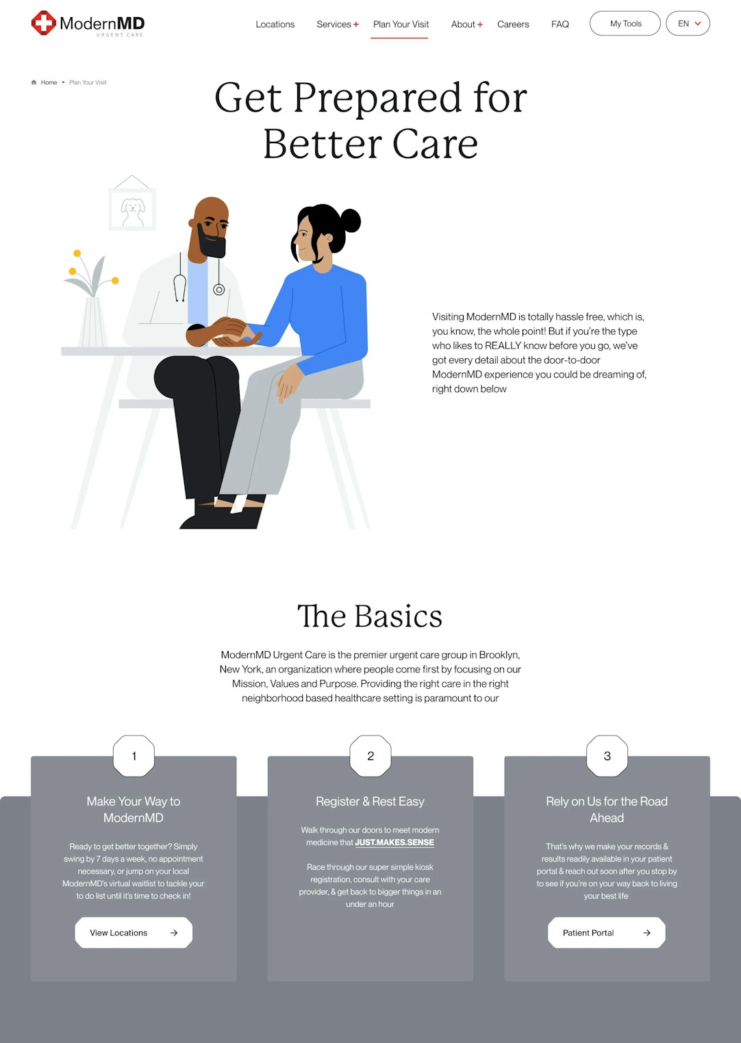 In 2015, when ModernMD Urgent Care operated from a single location, we created a contemporary website to match their vision. Fast forward to 2021, with an impressive network spanning 15 citywide locations, we once again embarked on a design journey to create a fresh online presence, prioritizing both performance and user-friendliness.