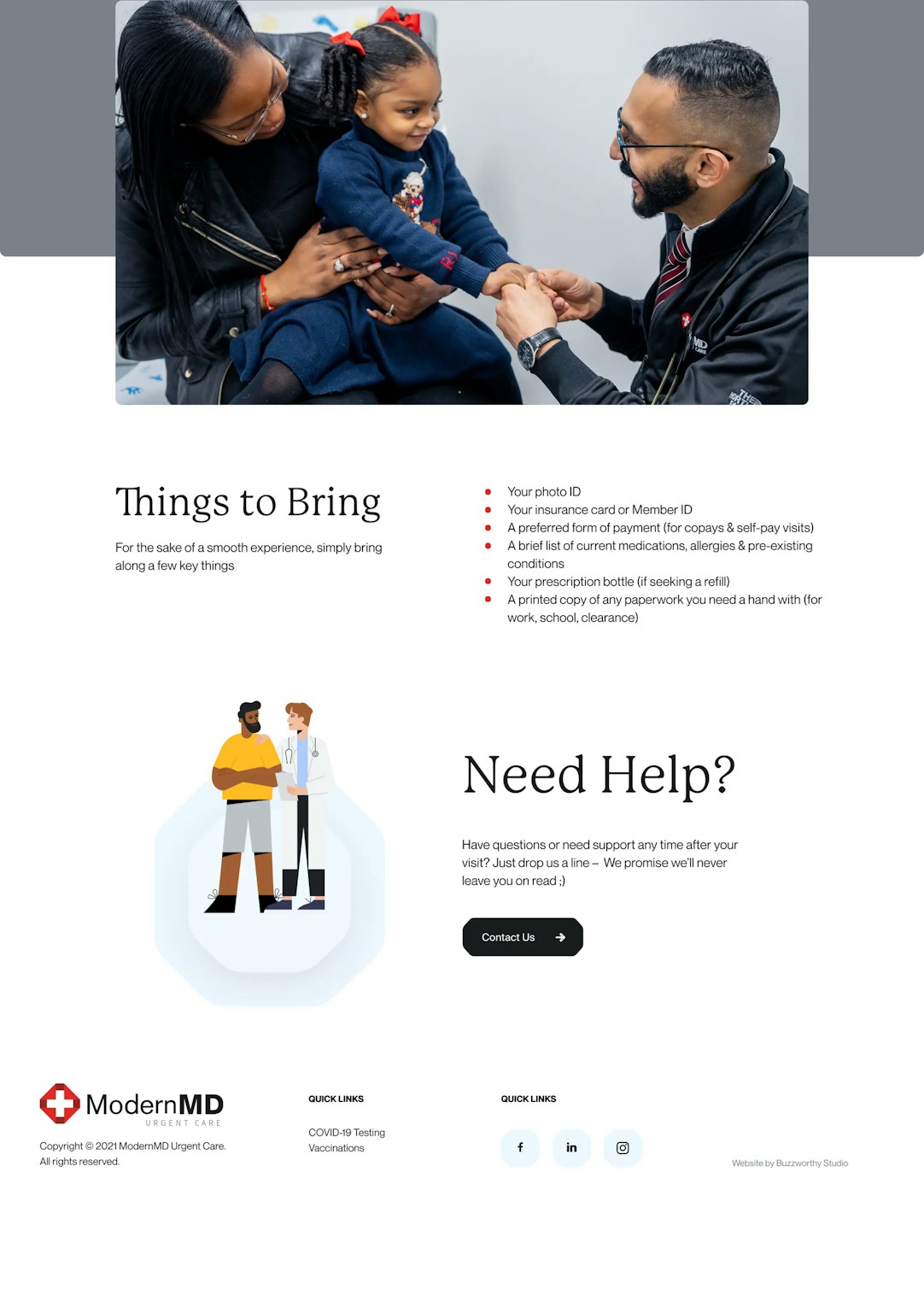 Given the surge in customer volume, simplicity became paramount. Our focus was on ensuring users could swiftly locate a nearby facility, search for illnesses or injuries that can be treated at each facility, and seamlessly schedule appointments. The result? A streamlined, user-friendly website that elegantly caters to ModernMD's expanding reach and serves its growing clientele with utmost ease.